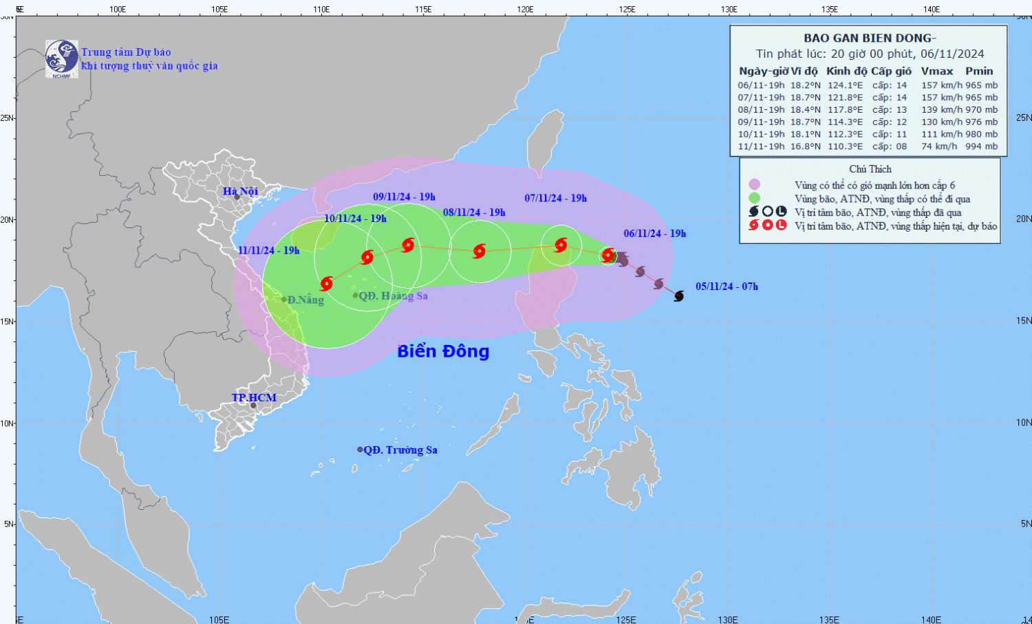 | 19h/08/11 | Tây Tây Nam, 15-20km/h, đi vào Biển Đông | 18,4N-117,8E; phía Đông khu vực Bắc Biển Đông, cách quần đảo Hoàng Sa 640km về phía Đông Đông Bắc | Cấp 13, giật cấp 16 | Vĩ tuyến 17,0N-21,0N; phía Đông kinh tuyến 116,0E | Cấp 3: phía Đông khu vực Bắc Biển Đông |