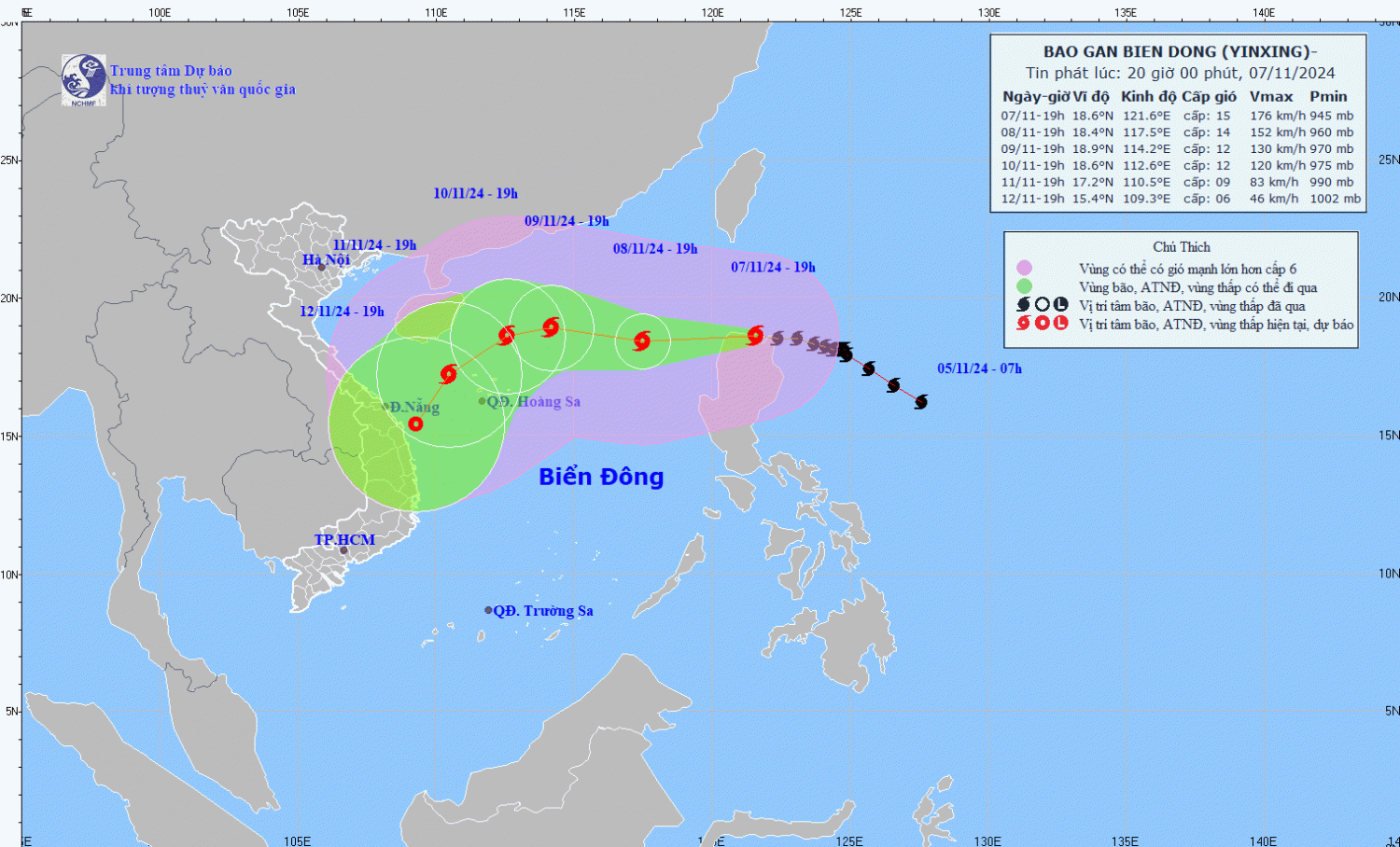 Hiện trạng bão: Hồi 19 giờ ngày 07/11, vị trí tâm bão ở vào khoảng 18,6 độ Vĩ Bắc; 121,6 độ Kinh Đông, trên vùng biển phía Bắc đảo Lu Dông (Phi-líp-pin). Sức gió mạnh nhất vùng gần tâm bão mạnh cấp 15 (167-183km/h), giật trên cấp 17. Di chuyển theo hướng Tây, tốc độ 10-15km/h.