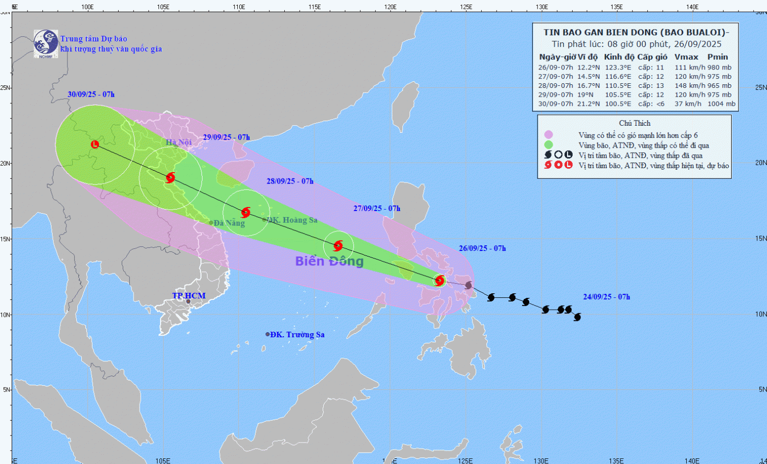 Hình1. Bản đồ dự báo quỹ đạo và cường độ bão BUALOI phát lúc 08h00 ngày 26/9/2025