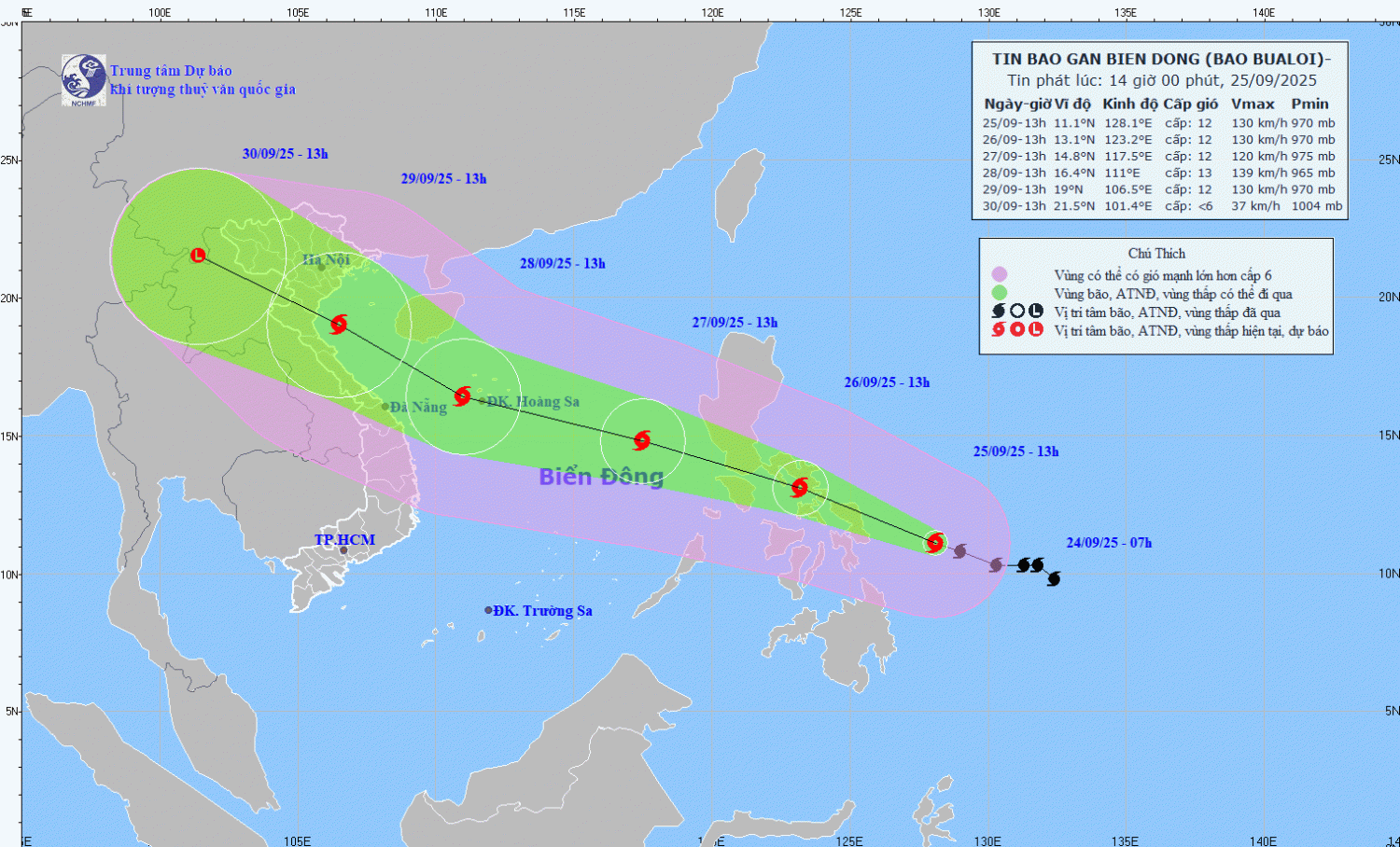 Hình1. Bản đồ dự báo quỹ đạo và cường độ bão BUALOI phát lúc 14h00 ngày 25/9/2025