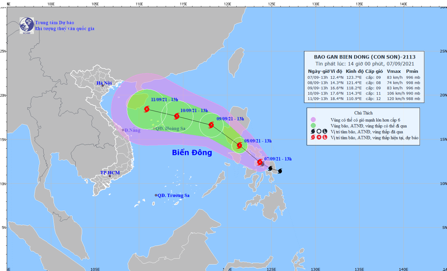 Trong 24 đến 48 giờ tiếp theo, bão di chuyển theo hướng Tây Bắc, mỗi giờ đi được 15-20km, đi vào Biển Đông và có khả năng mạnh thêm. Đến 13 giờ ngày 09/9, vị trí tâm bão ở khoảng 16,6 độ Vĩ Bắc; 118,2 độ Kinh Đông, cách quần đảo Hoàng Sa khoảng 600km về phía Đông. Sức gió mạnh nhất vùng gần tâm bão mạnh cấp cấp 9 (75-90km/giờ), giật cấp 11.