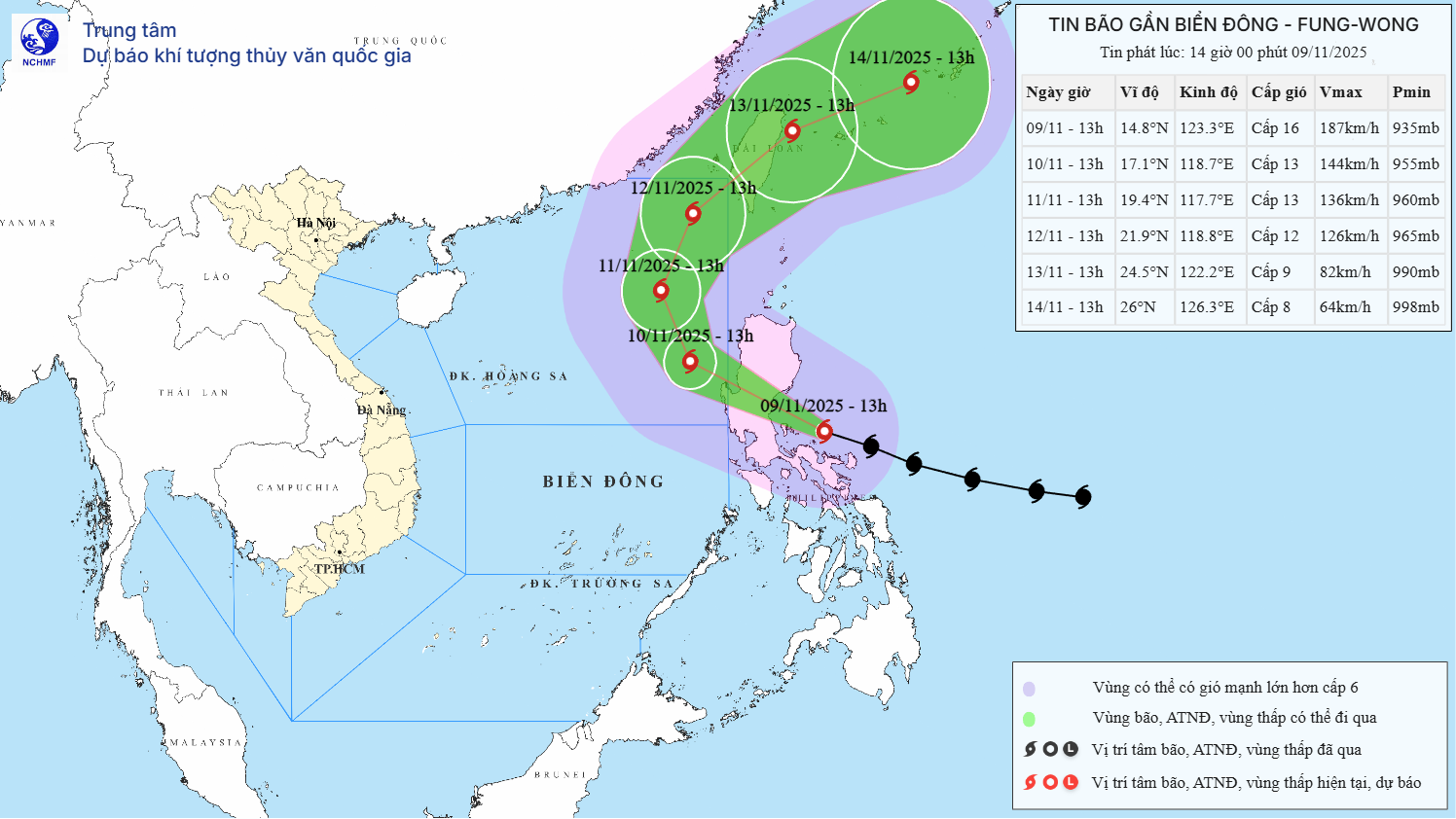 | 13 giờ ngày 10/11 | Tây Tây Bắc, 2025km/h | 17,1N- 118,7E; trên vùng biển phía Đông khu vực Bắc Biển Đông | Suy yếu dần. Cấp 13, giật cấp 16 | Vĩ tuyến 14,50N-19,00N; phía Đông kinh tuyến 117,00E | Cấp 3: vùng biển phía Đông khu vực Bắc Biển Đông |