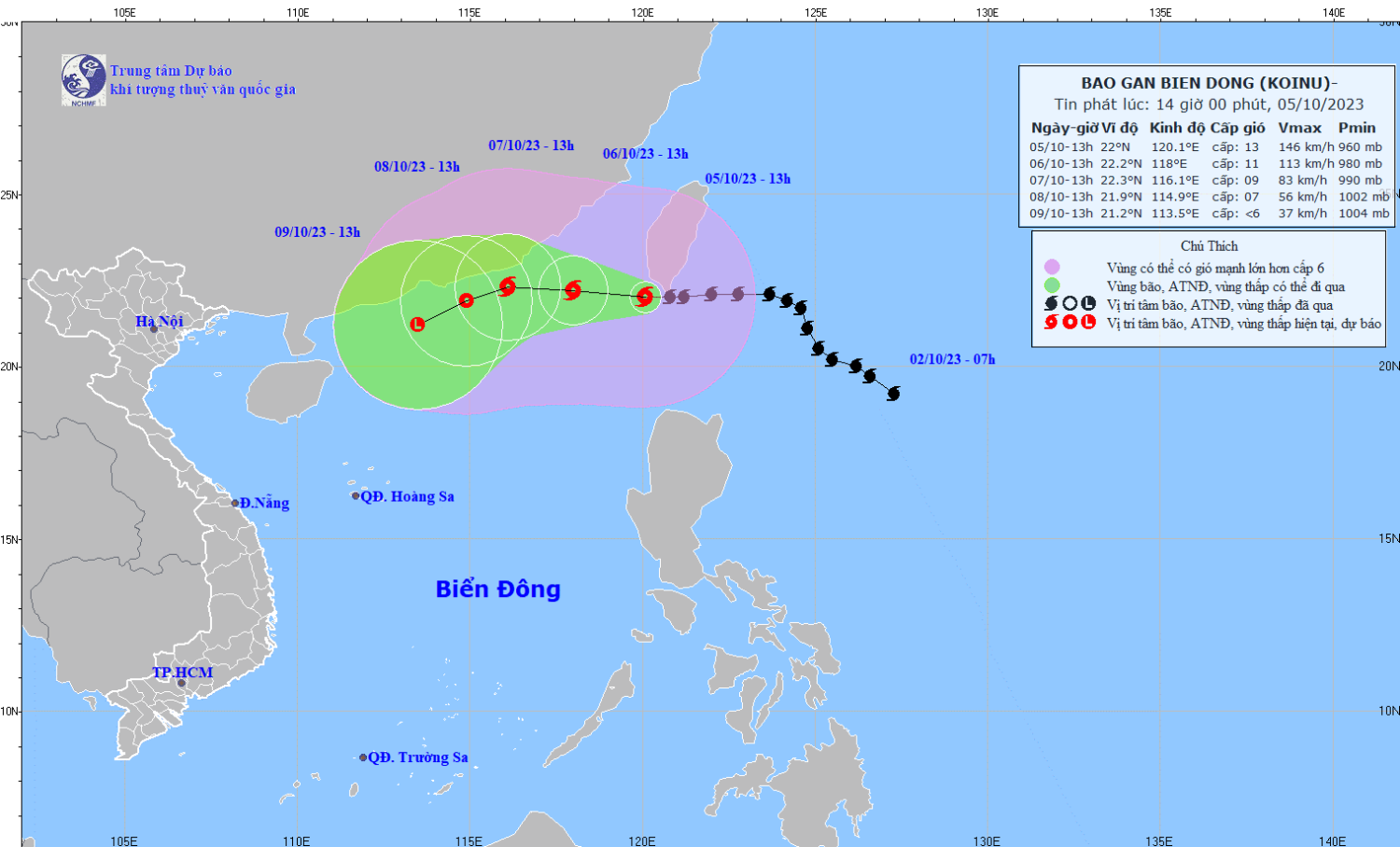 22,2N-118,0E, cách Quảng Đông (Trung Quốc) khoảng 180km về phía Đông Đông Nam | Cấp 10-11, giật cấp 13 | Phía Bắc vĩ tuyến 20,0N; phía Đông kinh tuyến 116,0E | Cấp 3: phía Đông Bắc khu vực Bắc Biển Đông |