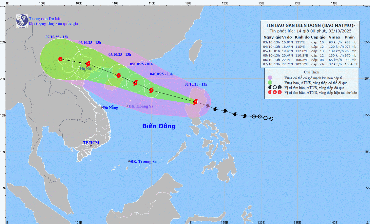 | 13 giờ ngày 04/10 | Tây Tây Bắc, khoảng 25km/h, đi vào Biển Đông và có khả năng mạnh thêm | 18,4N-115,0E; trên khu vực Bắc Biển Đông, cách bán đảo Lôi Châu (Trung Quốc) khoảng 480 km về phía Đông Đông Nam | Cấp 1112, giật cấp 15 | Vĩ tuyến 16,00N- 21,00N; phía Đông kinh tuyến 113,00E | Cấp 3: Khu vực Bắc Biển Đông |