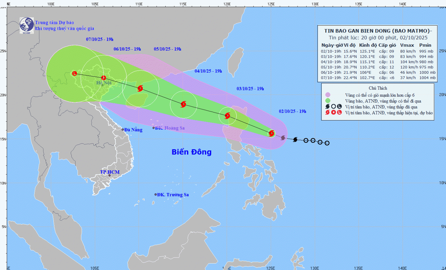 | 19 giờ ngày 04/10 | Tây Tây Bắc, 20-25km/h, đi vào Biển Đông và có khả năng mạnh lên | 18,9N-115,1E; trên khu vực Bắc Biển Đông, cách đặc khu Hoàng Sa khoảng 420km về phía Đông Bắc | Cấp 11, giật cấp 13 | Vĩ tuyến 16,50N- 21,00N; phía Đông kinh tuyến 113,00E | Cấp 3: vùng biển phía Bắc khu vực Bắc Biển Đông |