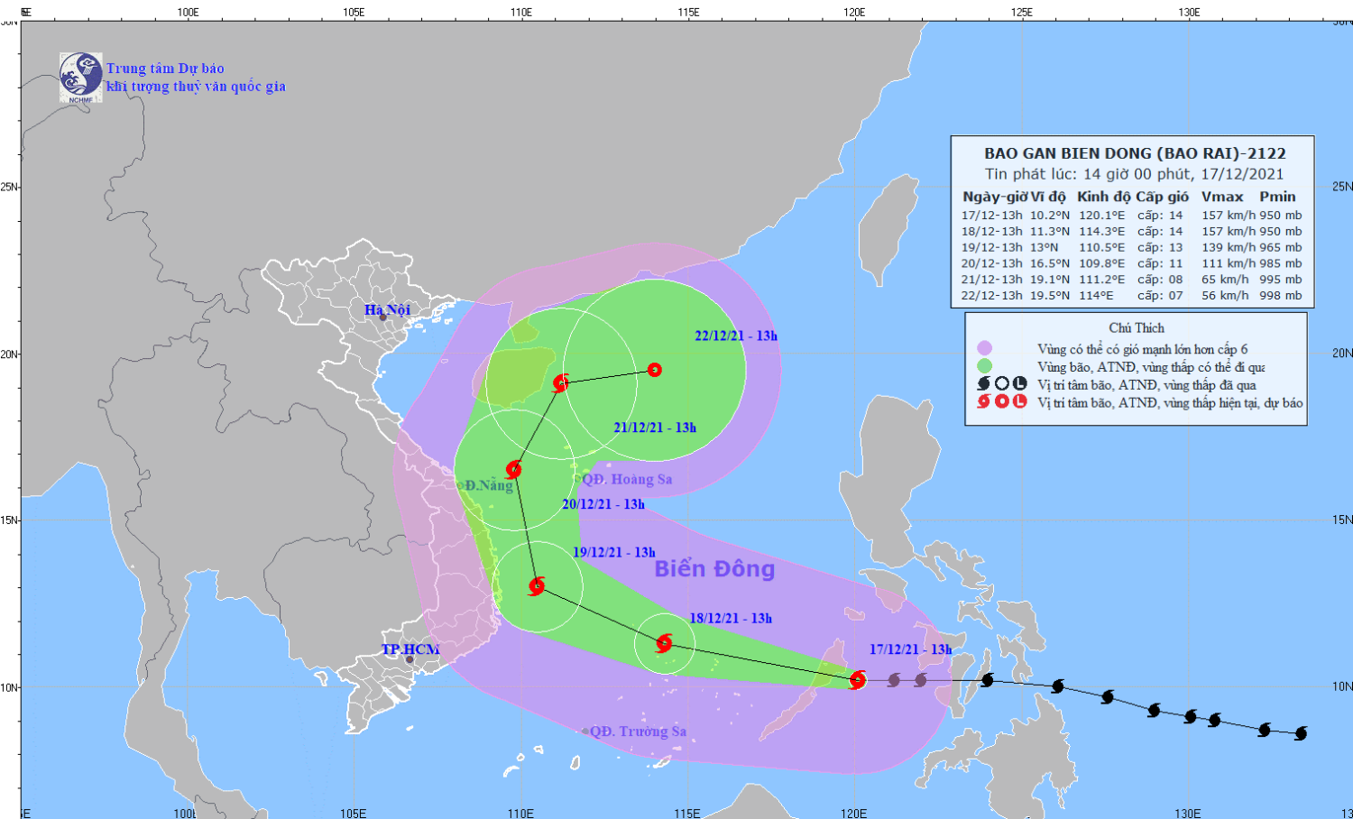 Hồi 13 giờ ngày 17/12, vị trí tâm bão ở khoảng 10,2 độ Vĩ Bắc; 120,1 độ Kinh Đông, ngay trên vùng biển phía Đông Bắc đảo Pa-la-oan (Phi-líp-pin). Sức gió mạnh nhất vùng gần tâm bão mạnh cấp 14 (150-165km/giờ), giật cấp 17.