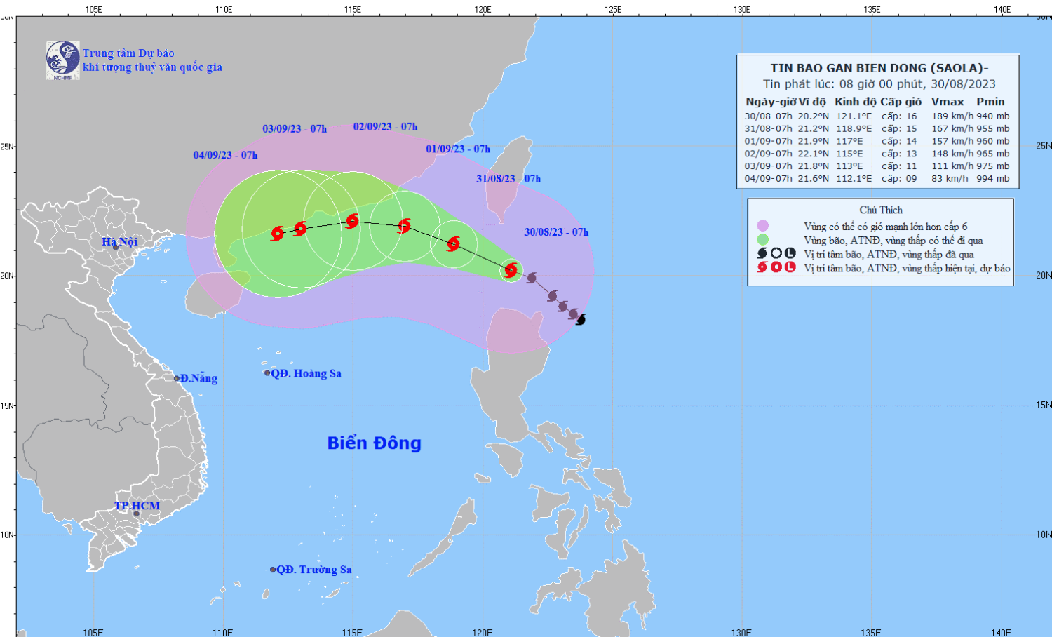| 07h/31/8 | Tây Tây Bắc, 10-15 km/h, di chuyển vào Biển Đông | 21,2N-118,9E | Cấp 15, giật trên cấp 17 | Phía Bắc vĩ tuyến 17,5N; phía Đông kinh tuyến 118,0E | Cấp 3: phía Đông Bắc của khu vực Bắc Biển Đông |