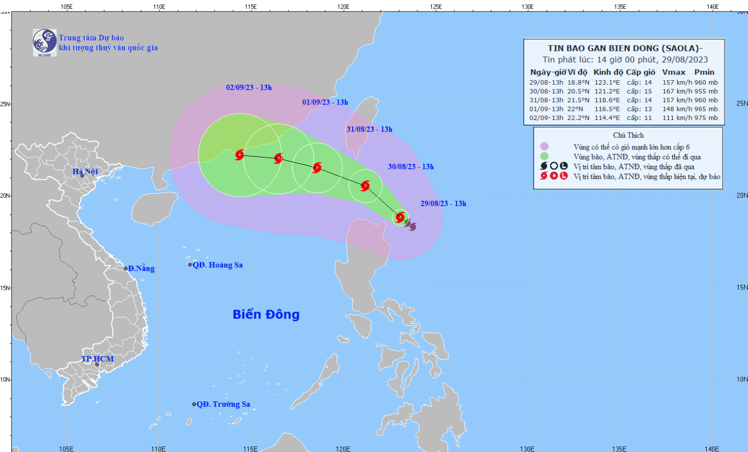 | 13h/30/8 | Tây Bắc, khoảng 10 km/h | 20,5N-121,2E | Cấp 14-15, giật trên cấp 17 | Phía Bắc vĩ tuyến 18,0N; phía Đông kinh tuyến 118,5E | Cấp 3: phía Đông Bắc của khu vực Bắc Biển Đông |