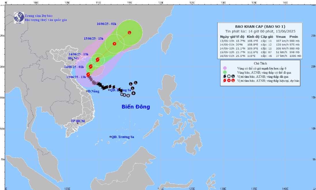 | 13h/14/6 | Bắc Đông Bắc, 1015km/h | 21,1N-109,9E; trên khu vực bán đảo Lôi Châu (Trung Quốc) | Cấp 11, giật cấp 13 | Phía Bắc vĩ tuyến 17,0N; 106,5E- 111,5E | Cấp 3: Vùng biển khu vực vịnh Bắc Bộ, vùng biển ngoài khơi từ Quảng Trị đến Đà Nẵng và phía Tây Bắc khu vực Bắc Biển Đông, |
