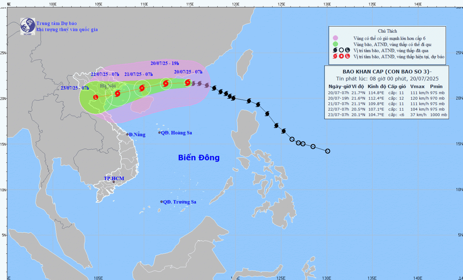 | 07h/22/7 | Tây Tây Nam, khoảng 15km/h | 20,5N-107,1E; trên vùng ven biển Quảng Ninh - Ninh Bình | Cấp 1011, giật cấp 14 | Phía Bắc vĩ tuyến 19,5N; Phía Tây kinh tuyến 112,5E | Cấp 3: vùng biển phía Tây Bắc khu vực Bắc Biển Đông, vùng biển vịnh Bắc Bộ |