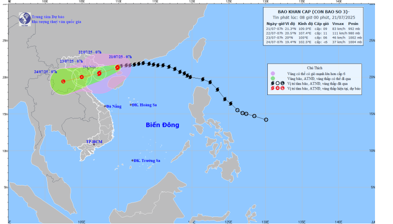 Hình 1. Bản đồ dự báo quỹ đạo và cường độ bão số 3 phát lúc 08h00 ngày 21/7/2025
