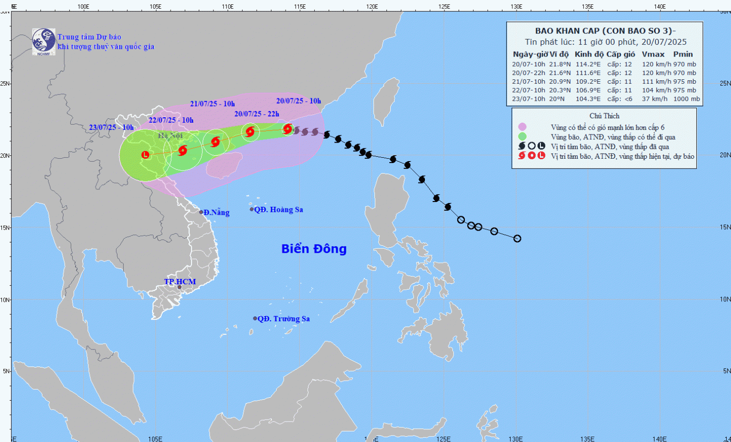 | 10h/21/7 | Tây, sau chuyển hướng Tây Tây Nam, 2025km/h | 20,9N- 109,2E; trên vùng biển phía Đông khu vực Bắc vịnh Bắc Bộ | Cấp 11, giật cấp 14 | Phía Bắc vĩ tuyến 19,5N; kinh tuyến 107,5E- 115,5E | Cấp 3: vùng biển phía Bắc khu vực Bắc Biển Đông, phía Đông khu vực Bắc vịnh Bắc Bộ |