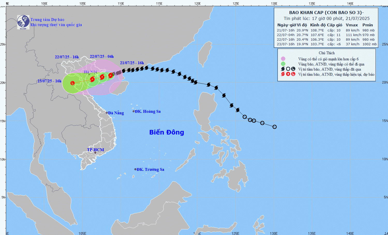 Hiện trạng bão: Hồi 16 giờ ngày 21/7, vị trí tâm bão ở vào khoảng 20,9 độ Vĩ Bắc; 108,7 độ Kinh Đông, cách Quảng Ninh khoảng 100km, cách Hải Phòng 220km; cách Hưng Yên khoảng 240km, cách Ninh Bình khoảng 270km. Sức gió mạnh nhất vùng gần tâm bão mạnh cấp 910 (75-102km/giờ), giật cấp 12; di chuyển theo hướng Tây Tây Nam với tốc độ khoảng 15km/h.