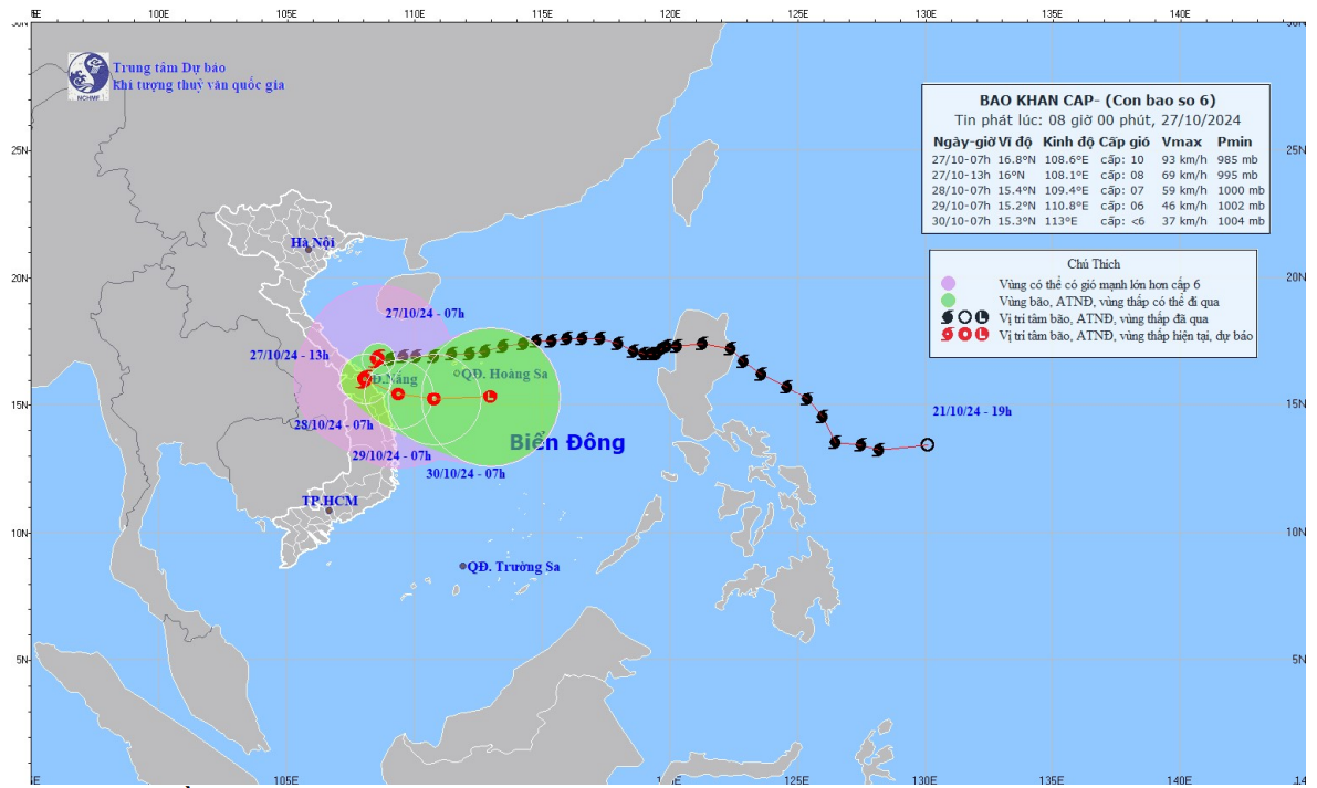 | 07h/29/10 | Đông, 510km/h | 15,2N-110,8E; trên vùng biển ngoài khơi Trung Trung Bộ | Cấp 6, giật cấp 8 | Vĩ tuyến 14,5N-19,0N; phía Tây kinh tuyến 112,0E | Cấp 3: phía Tây khu vực Bắc và Giữa Biển Đông (bao gồm vùng biển phía Tây quần đảo Hoàng Sa), vùng biển Trung Trung Bộ |