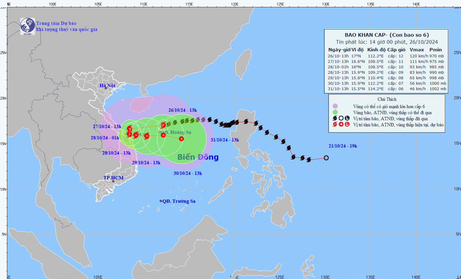 Hiện trạng bão: Hồi 13 giờ ngày 26/10, vị trí tâm bão ở vào khoảng 17,0 độ Vĩ Bắc; 112,2 độ Kinh Đông, trên vùng biển phía Bắc quần đảo Hoàng Sa, cách Đà Nẵng khoảng 440km về phía Đông Đông Bắc. Sức gió mạnh nhất vùng gần tâm bão mạnh cấp 11-12 (103-133km/h), giật cấp 15. Di chuyển theo hướng Tây Tây Nam, tốc độ khoảng 20km/h.