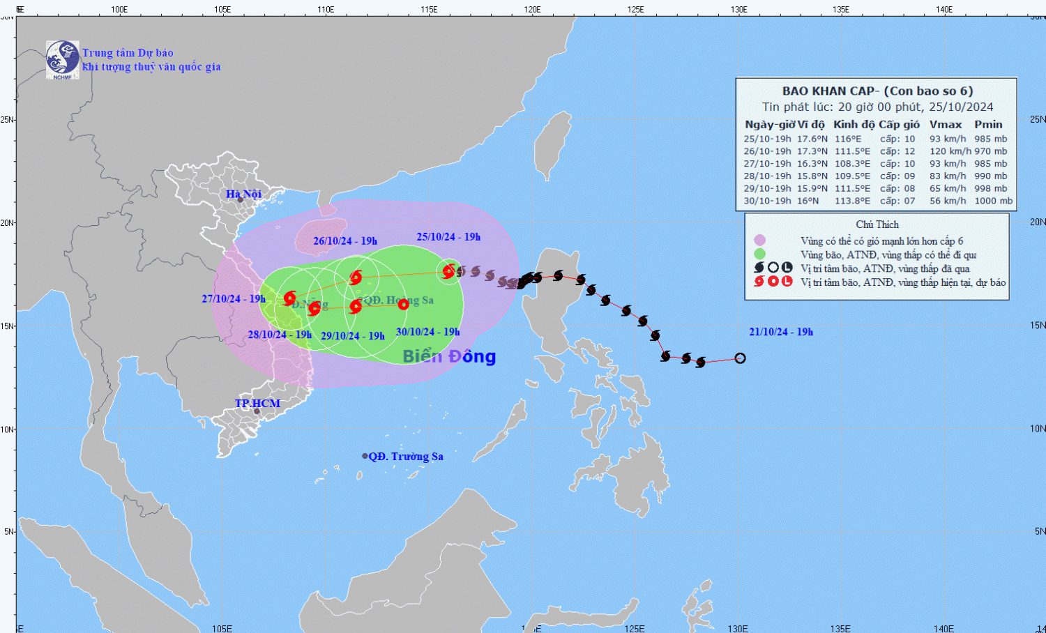 | 19h/27/10 | Tây Tây Nam, khoảng 15km/h | 16,3N-108,3E; trên vùng biển ven bờ các tỉnh Trung Trung Bộ | Cấp 10, giật cấp 12 | Vĩ tuyến 15,0N-19,0N; phía Tây kinh tuyến 113,5E | Cấp 3: phía Tây khu vực Bắc Biển Đông (bao gồm khu vực quần đảo Hoàng Sa), vùng biển Trung Trung Bộ |