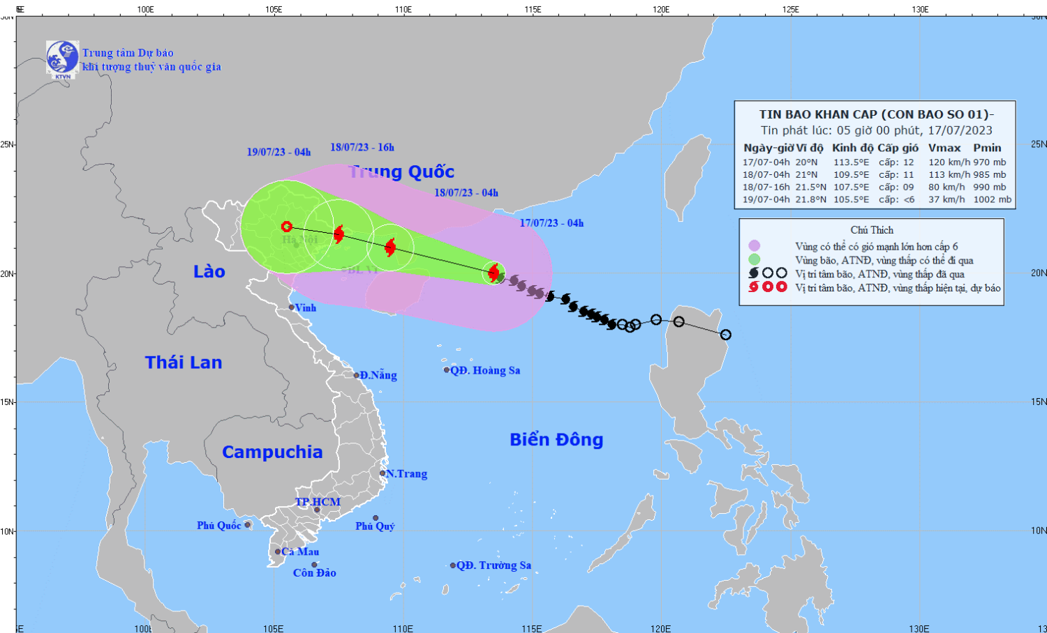 | 04h/18/7 | Tây Tây Bắc, 15-20 km/h. Bão có khả năng mạnh thêm | 21,0N-109,5E; trên khu vực phía Tây bán đảo Lôi Châu (Trung Quốc), cách Móng Cái (Quảng Ninh) khoảng 190km về phía Đông Đông Nam, cách Hải Phòng khoảng 290km về phía Đông | cấp 11-12, giật cấp 15 | Phía Bắc vĩ tuyến 17,5N; 107,5E- 115,5E | Cấp 3: phía Bắc khu vực Bắc Biển Đông, Bắc Vịnh Bắc Bộ |