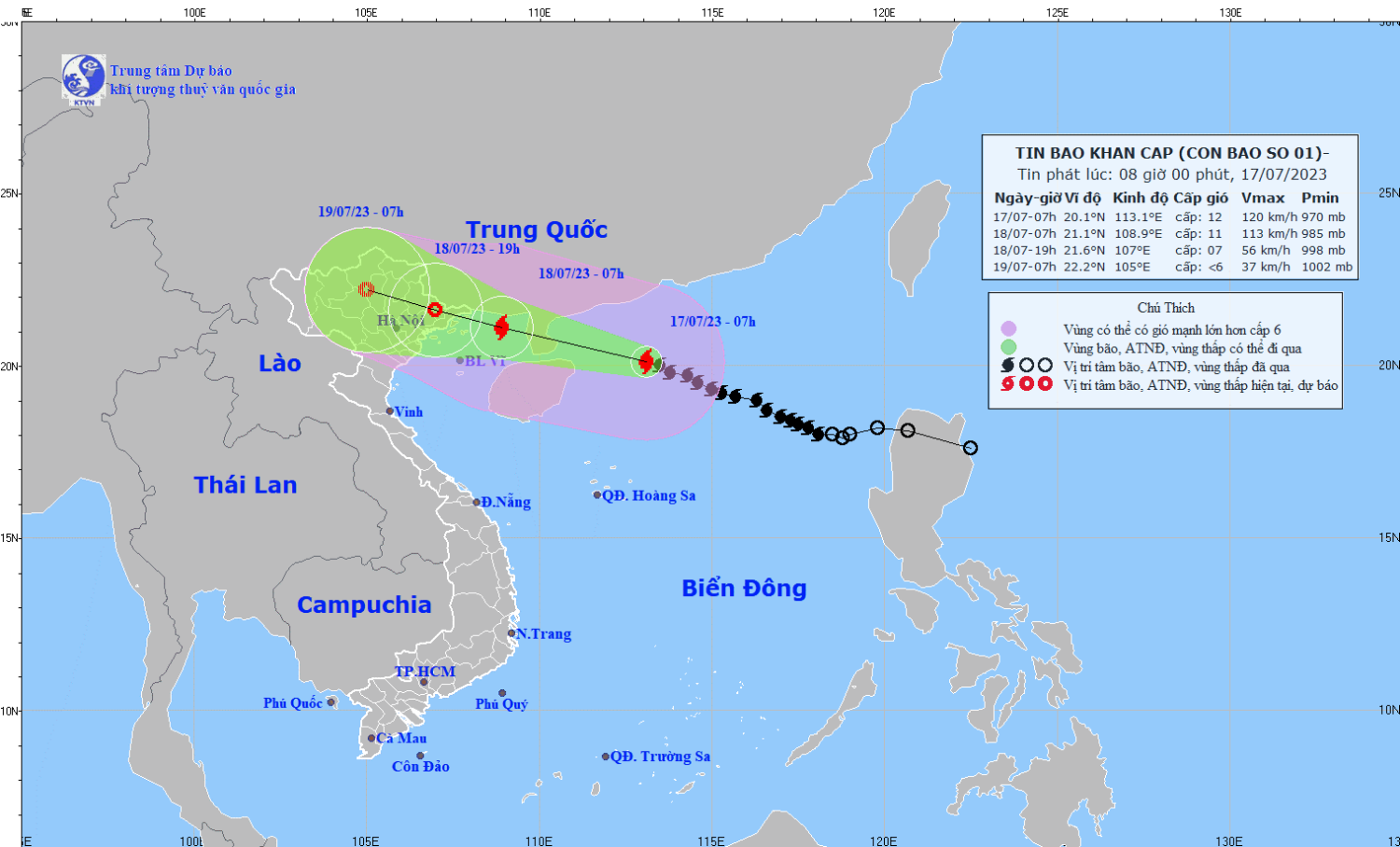 Hiện trạng bão: Hồi 07 giờ ngày 17/7, vị trí tâm bão ở vào khoảng 20,1 độ Vĩ Bắc; 113,1 độ Kinh Đông, cách bán đảo Lôi Châu (Trung Quốc) khoảng 290km về phía Đông Đông Nam. Sức gió mạnh nhất vùng gần tâm bão mạnh cấp 12 (118-133km/giờ), giật cấp 15.