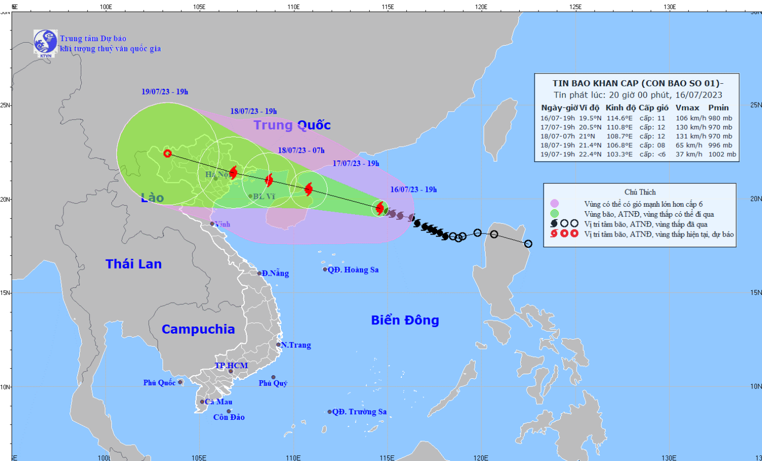 | 19h/19/7 | Tây Tây Bắc, 15-20 km/h | 22,4N-103,3E; trên khu vực phía Tây Bắc Bộ | < cấp 6 |
