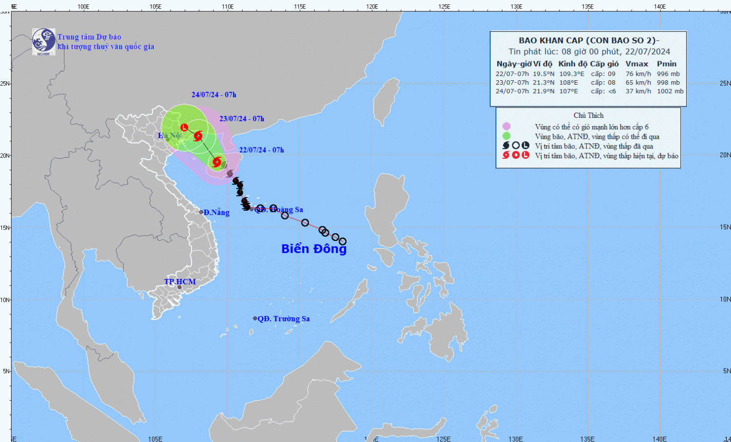 Hồi 07 giờ ngày 22/7, vị trí tâm bão ở vào khoảng 19,5 độ Vĩ Bắc; 109,3 độ Kinh Đông, trên khu vực đảo Hải Nam (Trung Quốc). Sức gió mạnh nhất vùng gần tâm bão mạnh cấp 8-9 (62-88km/h), giật cấp 11, di chuyển theo hướng Tây Bắc với tốc độ khoảng 15km/h.