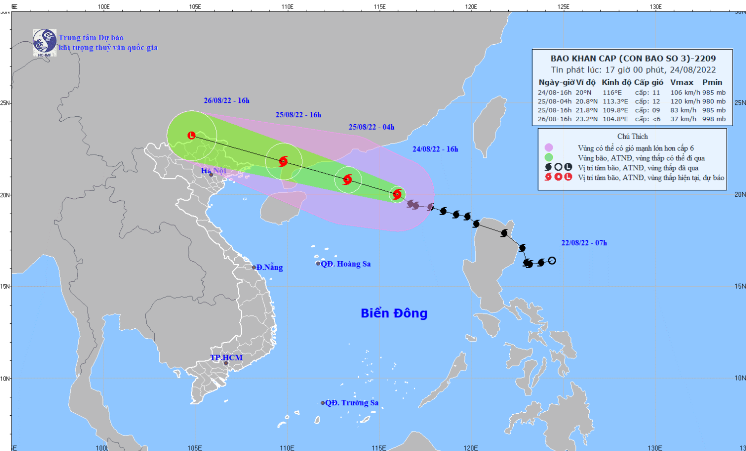 Dự báo trong 12 giờ tới, bão di chuyển chủ yếu theo hướng Tây Tây Bắc, mỗi giờ đi được khoảng 25km. Đến 04 giờ ngày 25/8, vị trí tâm bão ở khoảng 20,8 độ Vĩ Bắc; 113,3 độ Kinh Đông, cách Móng Cái (Quảng Ninh) khoảng 490km về phía Đông Đông Nam. Sức gió mạnh nhất vùng gần tâm bão mạnh cấp 11-12 (103-133km/giờ), giật cấp 15.