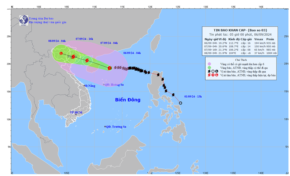 Hiện trạng bão: Hồi 04 giờ ngày 06/9, vị trí tâm siêu bão ở vào khoảng 19,2 độ Vĩ Bắc; 112,7 độ Kinh Đông, trên vùng biển phía Bắc khu vực Bắc Biển Đông, cách đảo Hải Nam (Trung Quốc) khoảng 200km về phía Đông Đông Nam; cách Quảng Ninh khoảng 620km về phía Đông Nam. Sức gió mạnh nhất vùng gần tâm siêu bão mạnh cấp 16 (184-201km/h), giật trên cấp 17, di chuyển theo hướng Tây, tốc độ khoảng 20km/h.