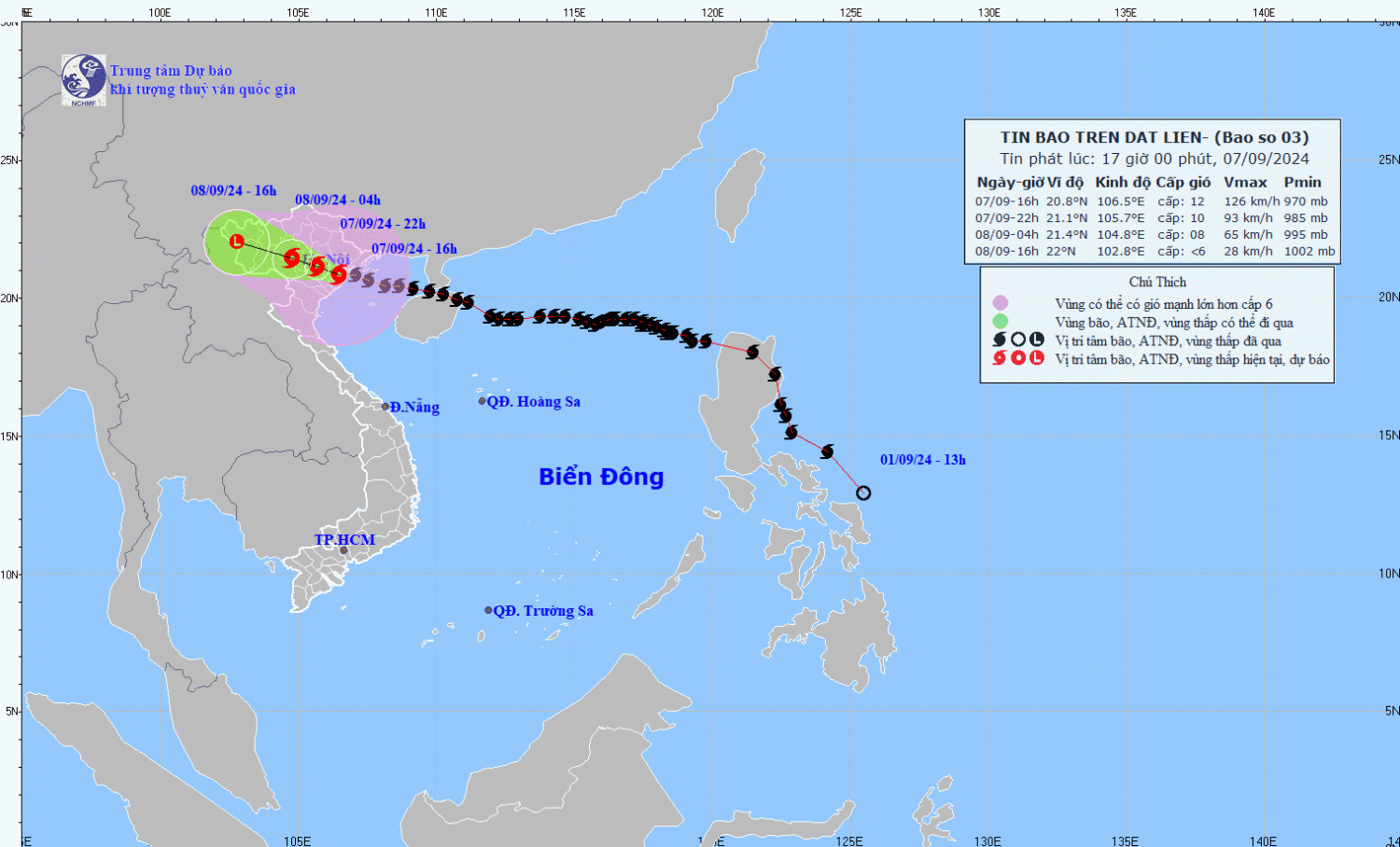| 04h/08/9 | Tây Tây Bắc, 15-20km/h, đi vào đất liền phía Đông Bắc Bộ |