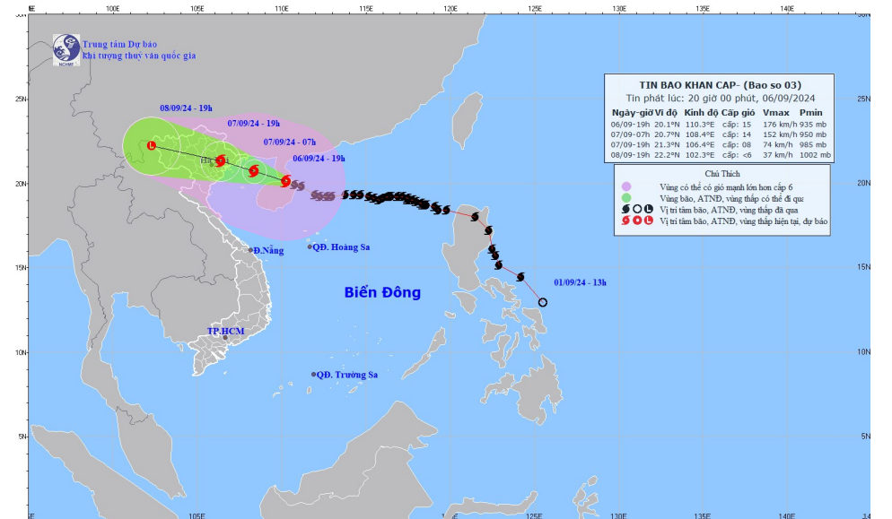 - Vùng biển phía Tây Bắc của khu vực Bắc Biển Đông đêm 06/9 còn có gió mạnh cấp 8 - 10, vùng gần tâm bão cấp 11-13, giật cấp 16; biển động dữ dội. Ngày 07/9 gió giảm dần.