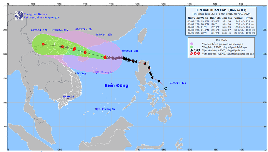 Hiện trạng bão: Hồi 22 giờ ngày 05/9, vị trí tâm siêu bão ở vào khoảng 19,3 độ Vĩ Bắc; 113,8 độ Kinh Đông, trên vùng biển phía Bắc khu vực Bắc Biển Đông, cách đảo Hải Nam (Trung Quốc) khoảng 300km về phía Đông. Sức gió mạnh nhất vùng gần tâm siêu bão mạnh cấp 16 (184-201km/h), giật trên cấp 17, di chuyển theo hướng Tây, tốc độ 1520km/h.