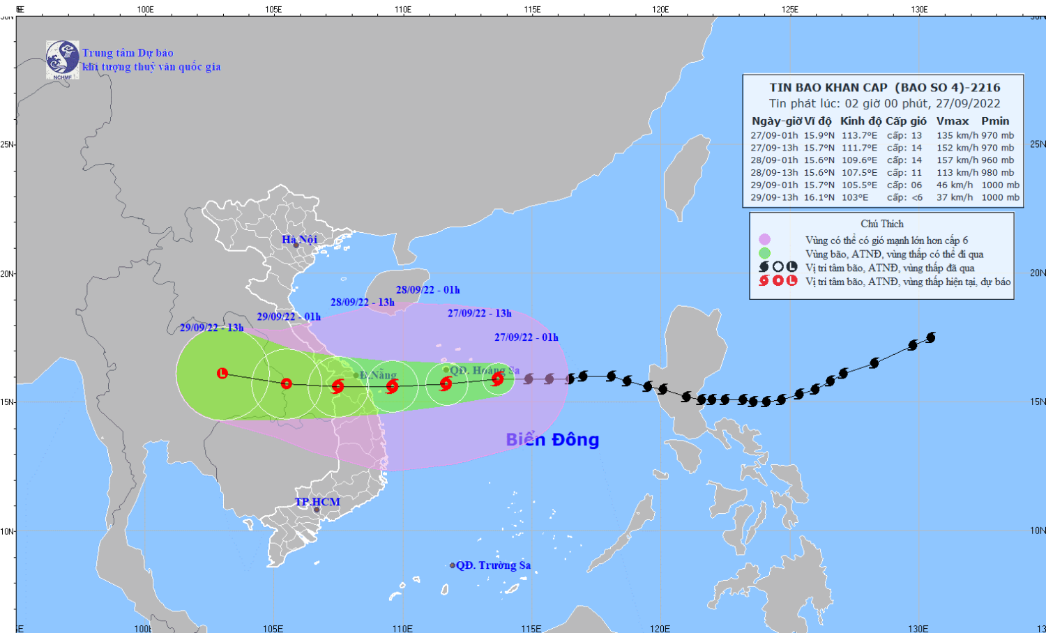 Hồi 01 giờ ngày 27/9, vị trí tâm bão ở khoảng 15,9 độ Vĩ Bắc; 113,7 độ Kinh Đông, cách quần đảo Hoàng Sa khoảng 220km về phía Đông. Sức gió mạnh nhất vùng gần tâm bão mạnh cấp 13 (134-149km/giờ), giật cấp 15. Bán kính gió mạnh từ cấp 6, giật từ cấp 8 trở lên khoảng 230km tính từ tâm bão; bán kính gió mạnh từ cấp 10, giật từ cấp 12 trở lên khoảng 100km tính từ tâm bão.