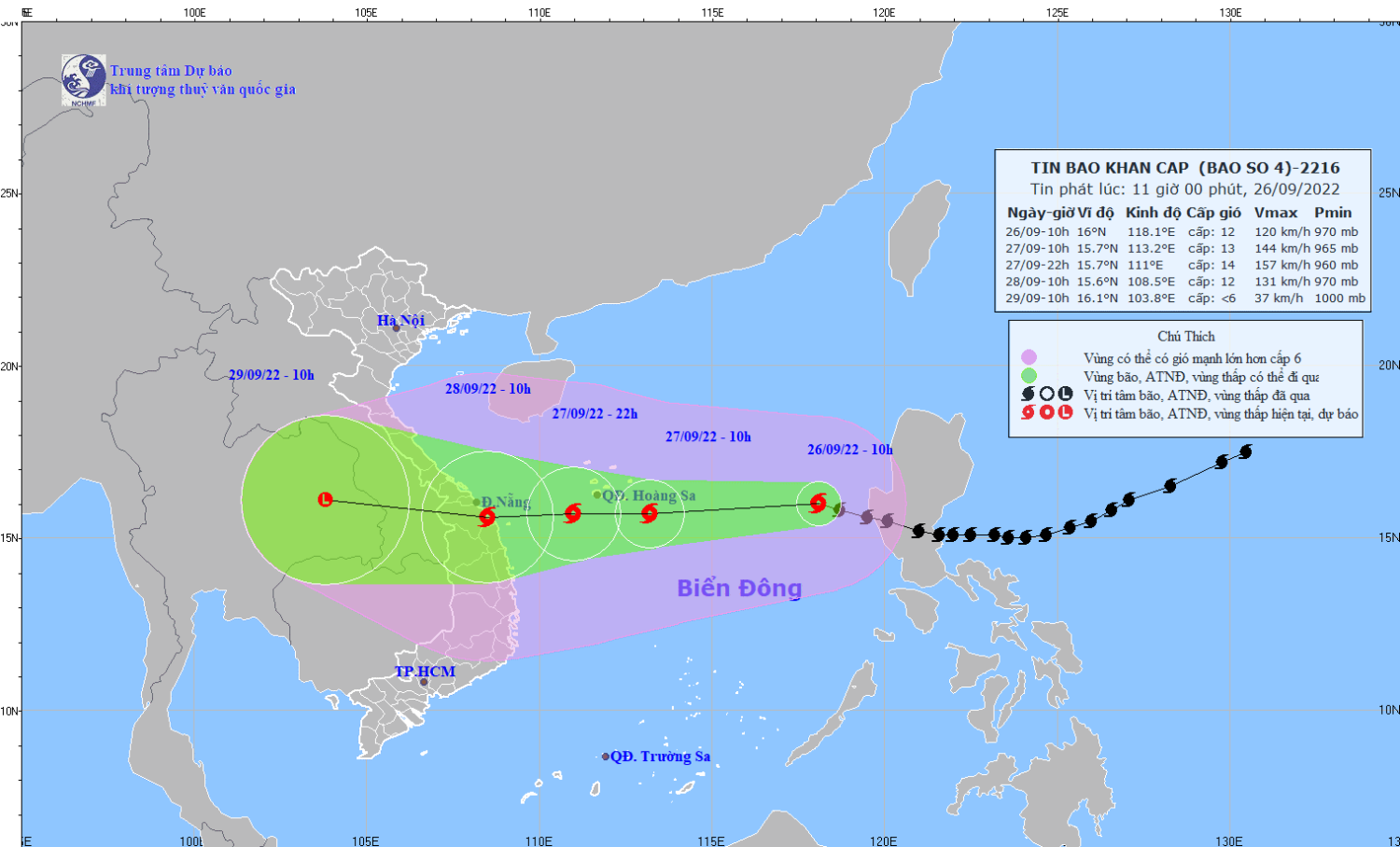Hồi 10 giờ ngày 26/9, vị trí tâm bão ở khoảng 16,0 độ Vĩ Bắc; 118,1 độ Kinh Đông, trên vùng biển phía Đông khu vực Bắc và giữa Biển Đông, cách quần đảo Hoàng Sa khoảng 650km về phía Đông. Sức gió mạnh nhất vùng gần tâm bão mạnh cấp 12 (118-133km/giờ), giật cấp 14. Bán kính gió mạnh từ cấp 6, giật từ cấp 8 trở lên khoảng 210km tính từ tâm bão; bán kính gió mạnh từ cấp 10, giật từ cấp 12 trở lên khoảng 100km tính từ tâm bão.