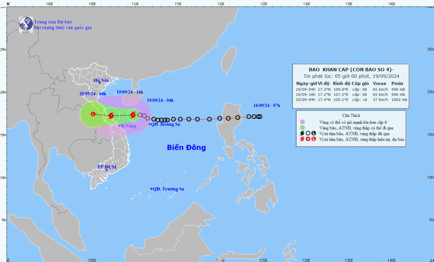 Hồi 04 giờ, vị trí tâm bão ở vào khoảng 17,3 độ Vĩ Bắc; 109,8 độ Kinh Đông, cách Đà Nẵng 210km về phía Đông Bắc, cách Quảng Trị khoảng 260km về phía Đông. Sức gió mạnh nhất vùng gần tâm bão mạnh cấp 8 (62-74km/h), giật cấp 10; di chuyển chủ yếu theo hướng Tây với tốc độ khoảng 20km/h.