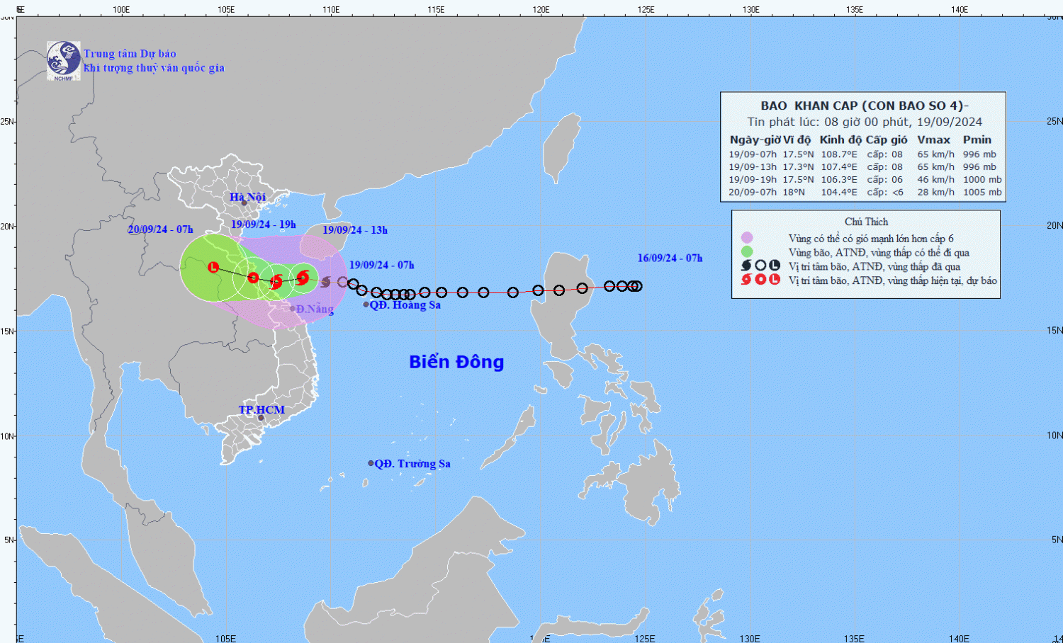 | 13h/19/9 | Tây, khoảng 20-25km/h | 17,3 N-107,4E; trên vùng biển ven bờ từ Quảng Quảng Bình đến Thừa Thiên Huế | Cấp 8, giật cấp 10 | 15,0N-19,5N; phía Tây kinh tuyến 112.0E | Cấp 3: Vùng biển phía Tây của khu vực Bắc Biển Đông (bao gồm khu vực quần đảo Hoàng Sa); vùng biển từ Nghệ An đến Quảng Ngãi (bao gồm đảo Lý Sơn, Cù Lao Chàm, Cồn Cỏ, Hòn Ngư); khu vực đất liền ven biển từ Hà Tĩnh đến Quảng Nam |
