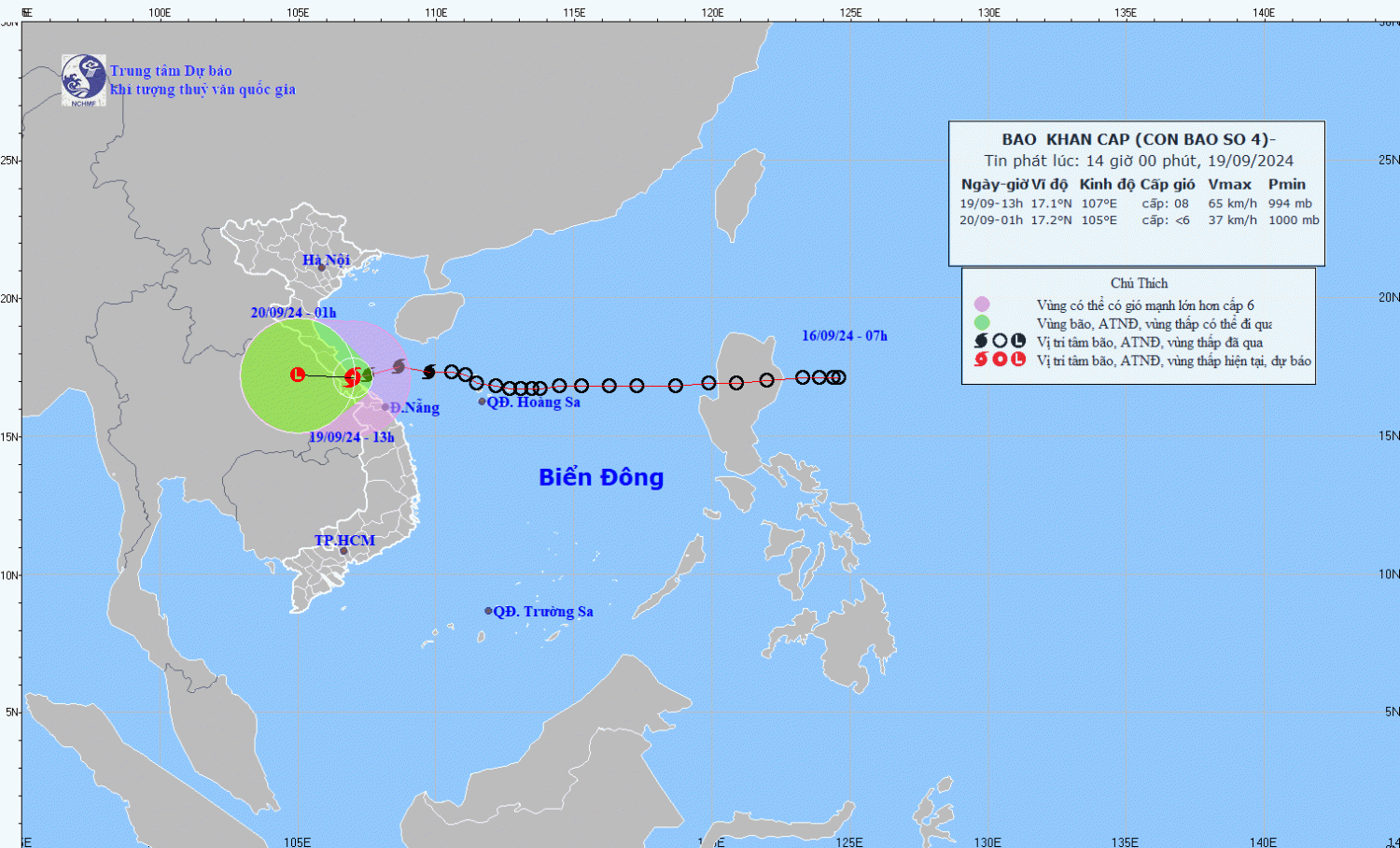 | 01h/20/9 | Tây, khoảng 15-20km/h, đi sâu vào đất liền và suy yếu dần | 17,2 N-105,0E; trên đất liền khu vực Trung Lào | < Cấp 6 | 15,5N-19,5N; phía Tây kinh tuyến 109.0E | Cấp 3: Vùng biển từ Nghệ An đến Đà Nẵng (bao gồm Cồn Cỏ, Hòn Ngư); khu vực đất liền ven biển từ Hà Tĩnh đến Quảng Trị |