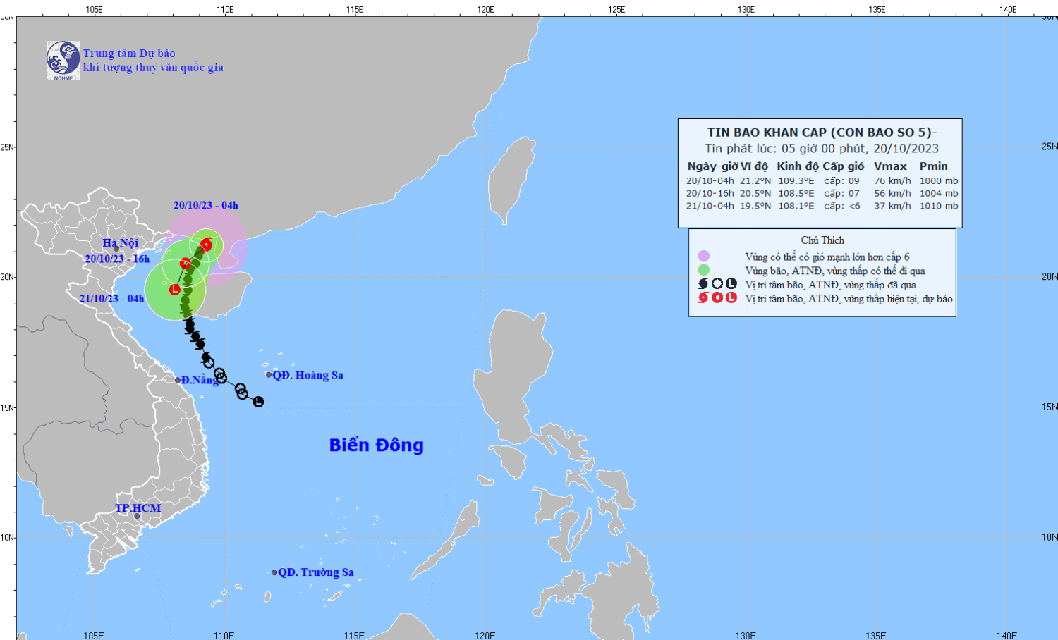 Hồi 04 giờ ngày 20/10, vị trí tâm bão ở vào khoảng 21,2 độ Vĩ Bắc; 109,3 độ Kinh Đông, trên vùng biển phía Đông Bắc khu vực Bắc Vịnh Bắc Bộ. Sức gió mạnh nhất vùng gần tâm bão mạnh cấp 8-9 (62-88km/giờ), giật cấp 11. Di chuyển theo hướng Bắc Đông Bắc với tốc độ khoảng 10km/h.