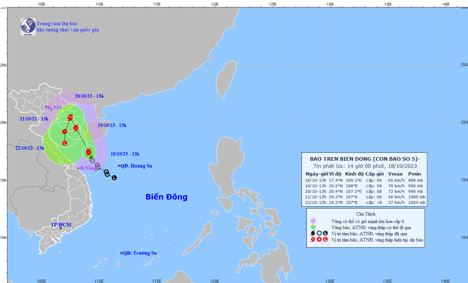 Hồi 13 giờ ngày 18/10, vị trí tâm bão ở vào khoảng 17,4 độ Vĩ Bắc; 109,1 độ Kinh Đông, trên vùng biển phía Nam đảo Hải Nam (Trung Quốc), cách đất liền khu vực Quảng Trị-Thừa Thiên Huế khoảng 200km về phía Đông Đông Bắc. Sức gió mạnh nhất vùng gần tâm bão mạnh cấp 8 (62-74km/giờ), giật cấp 10. Di chuyển theo hướng Bắc Tây Bắc với tốc độ khoảng 10km/h.