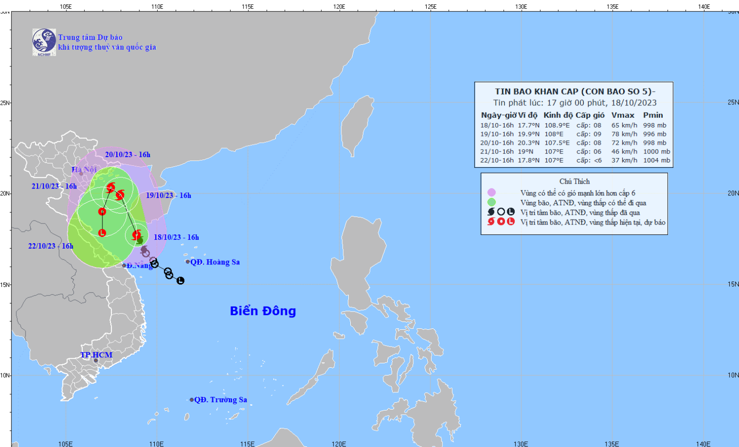 Hồi 16 giờ ngày 18/10, vị trí tâm bão ở vào khoảng 17,7 độ Vĩ Bắc; 108,9 độ Kinh Đông, trên vùng biển phía Nam đảo Hải Nam (Trung Quốc). Sức gió mạnh nhất vùng gần tâm bão mạnh cấp 8 (62-74km/giờ), giật cấp 10. Di chuyển theo hướng Bắc Tây Bắc với tốc độ khoảng 10km/h.
