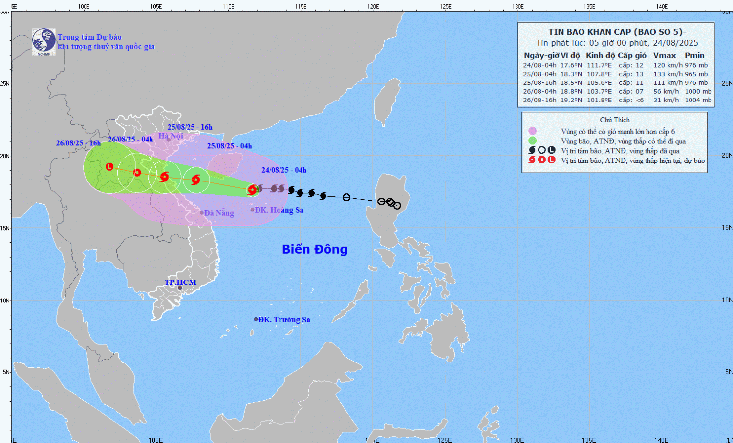 Hình 1. Bản đồ dự báo quỹ đạo và cường độ bão số 5 phát lúc 05h00 ngày 24/8/2025