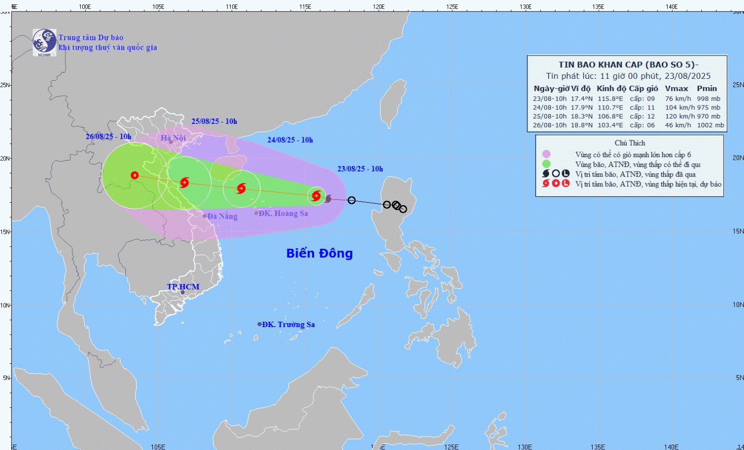 Hình 1. Bản đồ dự báo quỹ đạo và cường độ bão số 5 phát lúc 11h00 ngày 23/8/2025