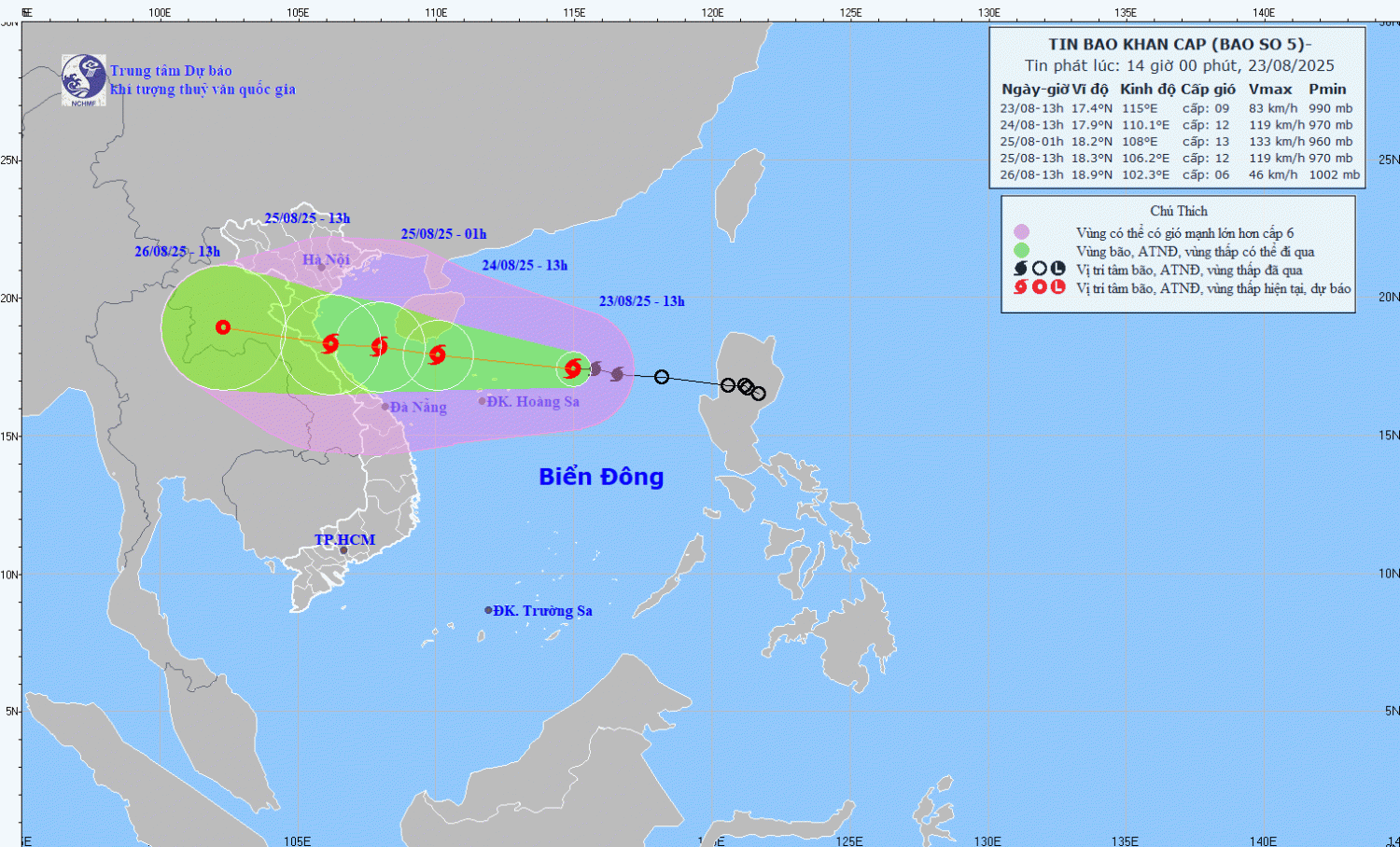 | 13 giờ ngày 25/8 | Tây Tây Bắc, 15-20km/h | 18,3N-106,2E; trên vùng biển ven bờ từ Thanh Hóa đến Quảng Trị | 12, giật 15 |