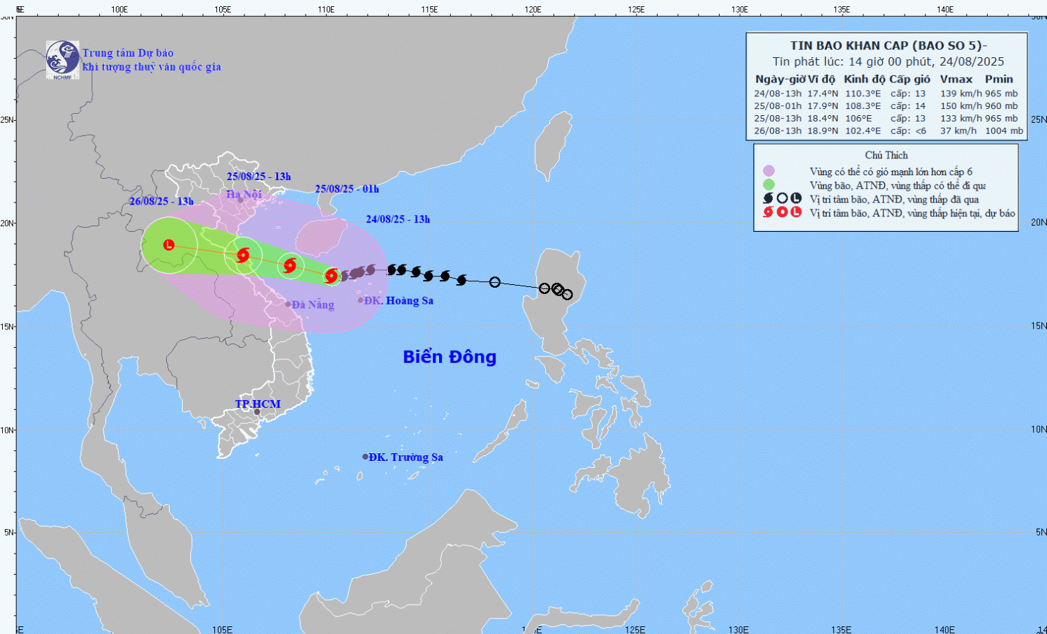 Hình 1. Bản đồ dự báo quỹ đạo và cường độ bão số 5 phát lúc 14h00 ngày 24/8/2025