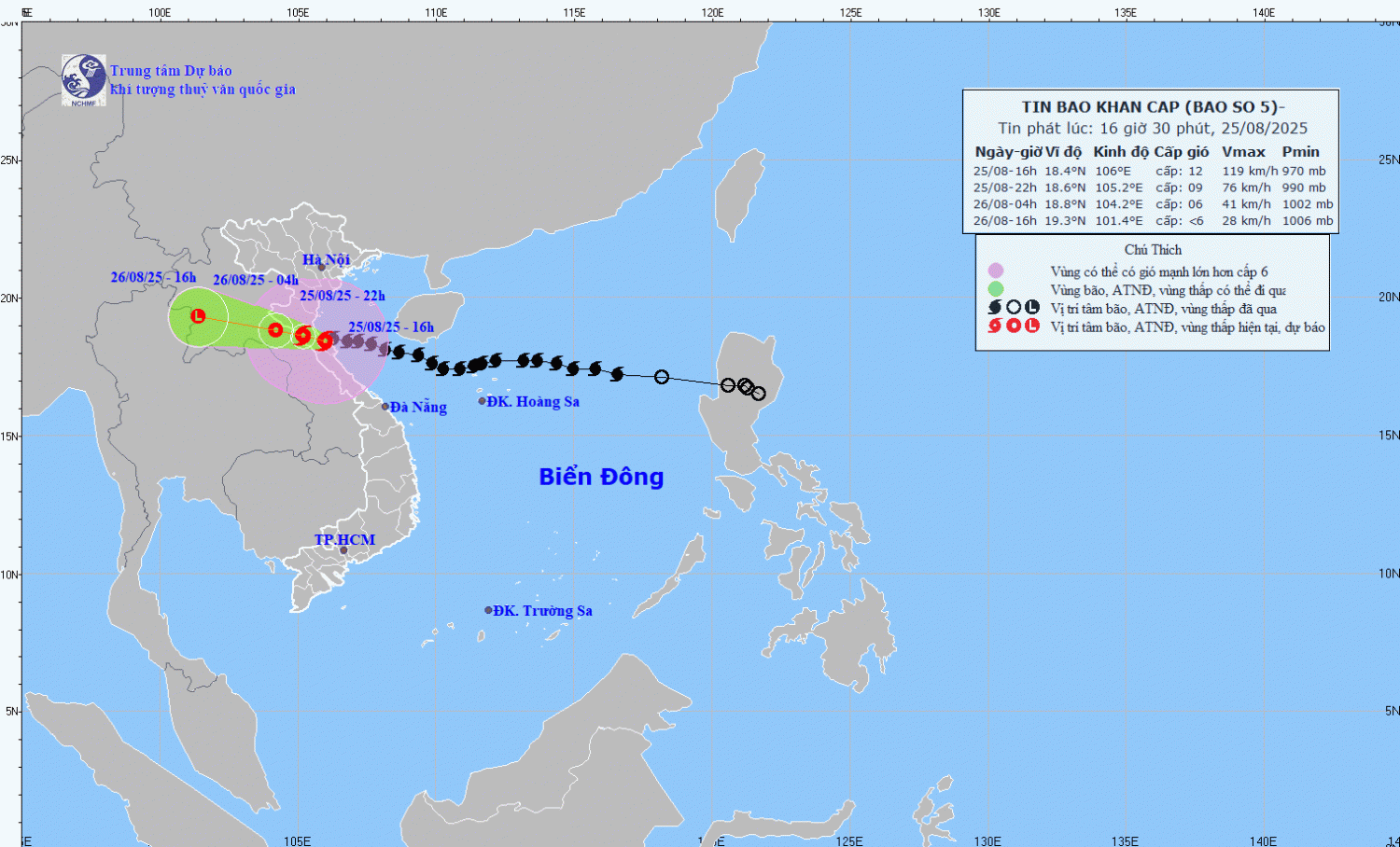 | 04 giờ ngày 26/8 | Tây Tây Bắc, 15- 20km/h | 18,8N- 104,2E; trên khu vực Trung Lào |