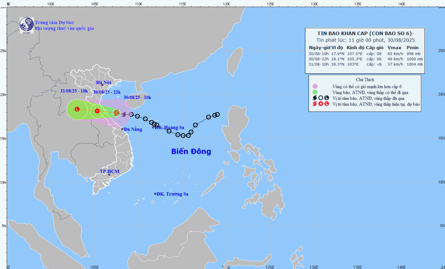 | 22 giờ ngày 30/8 | Tây Tây Bắc, khoảng 20km/h, đi vào đất liền các tỉnh Hà Tĩnh-Bắc Quảng Trị và suy yếu dần thành áp thấp nhiệt đới | 18,1N- 105,3E; trên khu vực biên giới Việt Nam-Lào | Cấp 6, giật cấp 8 | 16,5- 20,0N; phía Tây kinh tuyến 110,0E | Cấp 3: vùng biển từ Thanh Hóa đến Tp. Huế (bao gồm đảo Hòn Ngư, đặc khu Cồn Cỏ) |