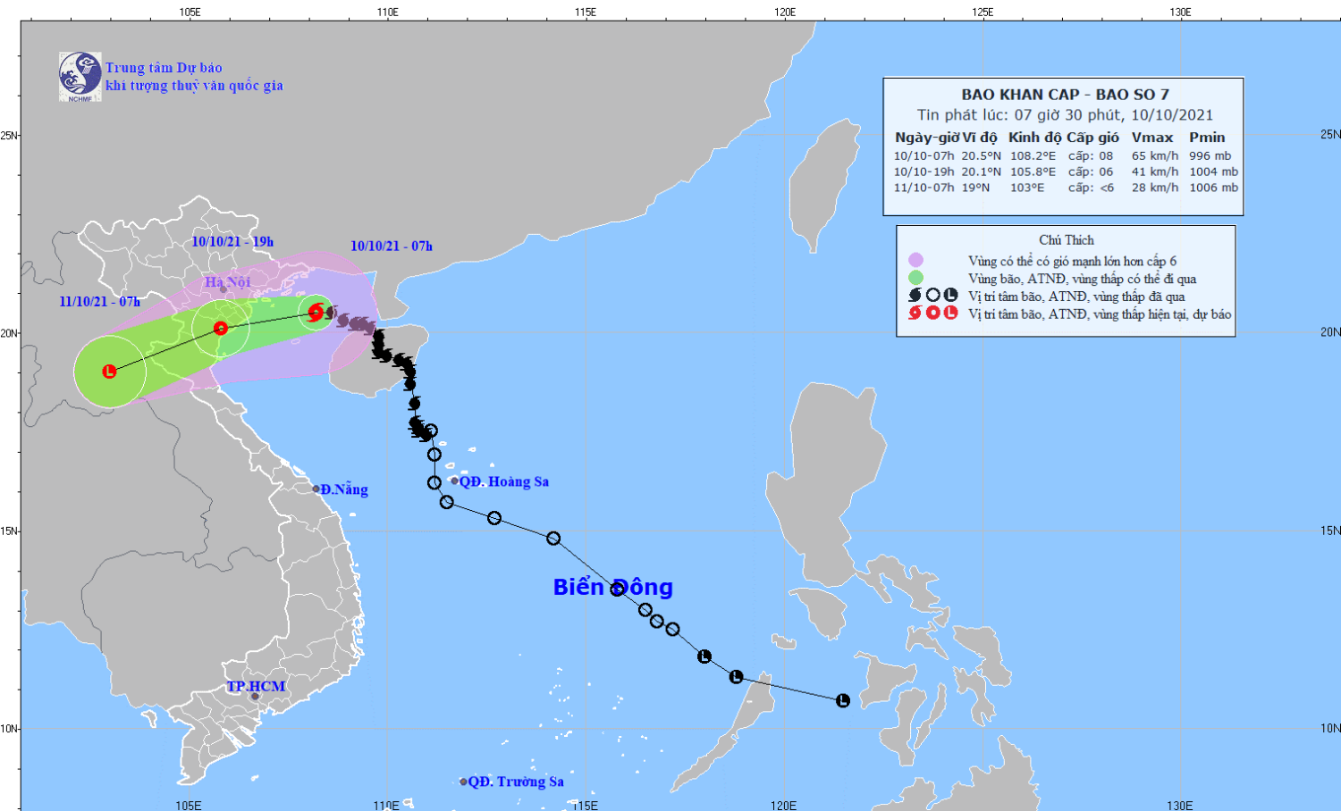 Hồi 07 giờ ngày 10/10, vị trí tâm bão ở vào khoảng 20,5 độ Vĩ Bắc; 108,2 độ Kinh Đông, cách Hải Phòng khoảng 170km, cách Nam Định khoảng 190km, cách Thanh Hóa khoảng 260km. Sức gió mạnh nhất vùng gần tâm bão mạnh cấp 8 (60-75km/giờ), giật cấp 10. Bán kính gió mạnh từ cấp 6, giật từ cấp 8 khoảng 120km tính từ tâm bão.