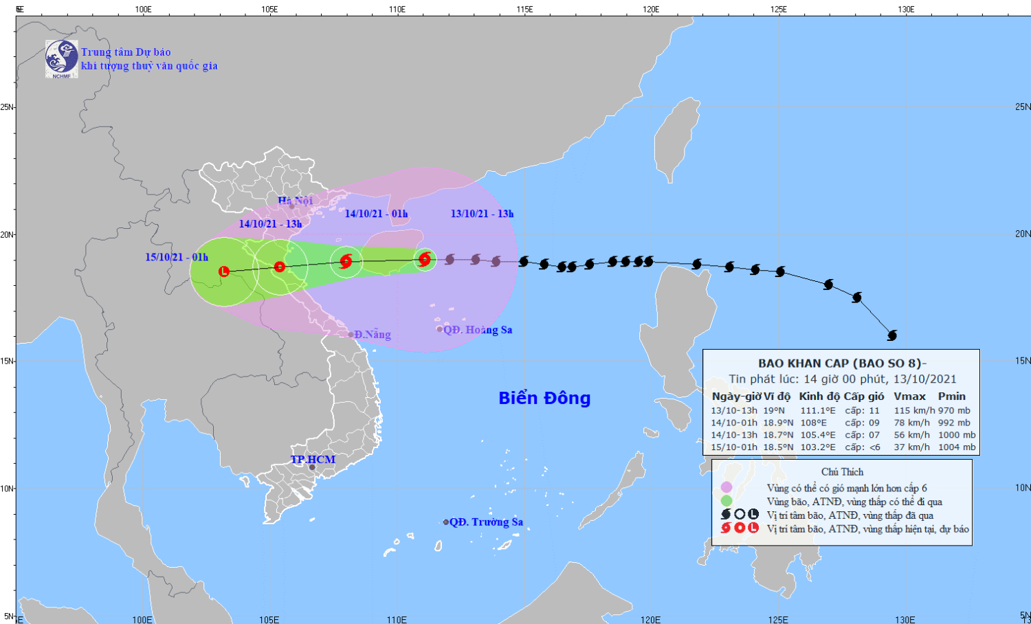 Hồi 13 giờ ngày 13/10, vị trí tâm bão ở khoảng 19,0 độ Vĩ Bắc; 111,1 độ Kinh Đông, trên vùng biển phía Đông đảo Hải Nam (Trung Quốc), cách Thanh Hóa khoảng 600km, cách Nghệ An khoảng 610km, cách Hà Tĩnh khoảng 540km. Sức gió mạnh nhất vùng gần tâm bão mạnh cấp 11 (100-120km/giờ), giật cấp 14. Bán kính gió mạnh từ cấp 6, giật từ cấp 8 trở lên khoảng 350km tính từ tâm bão.