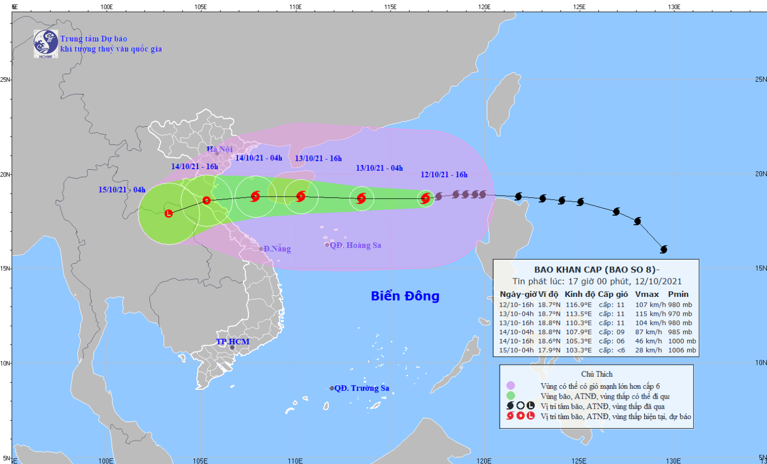 Hồi 16 giờ ngày 12/10, vị trí tâm bão ở khoảng 18,7 độ Vĩ Bắc; 116,9 độ Kinh Đông, cách quần đảo Hoàng Sa khoảng 530km về phía Đông Đông Bắc. Sức gió mạnh nhất vùng gần tâm bão mạnh cấp 10-11 (90-120km/giờ), giật cấp 13. Bán kính gió mạnh từ cấp 6, giật từ cấp 8 trở lên khoảng 350km tính từ tâm bão.