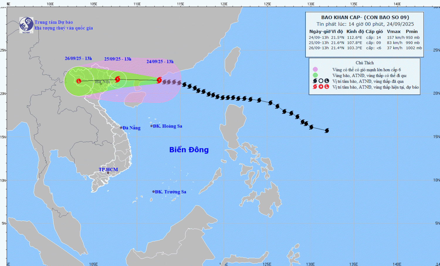 Hiện trạng bão: Hồi 13 giờ ngày 24/9, vị trí tâm bão ở vào khoảng 21,5 độ Vĩ Bắc; 112,6 độ Kinh Đông, cách Móng Cái (Quảng Ninh) khoảng 510km về phía Đông. Sức gió mạnh nhất vùng gần tâm bão mạnh cấp 14 (150-166km/giờ), giật cấp 17. Di chuyển theo hướng Tây Tây Bắc với tốc độ khoảng 20km/h.