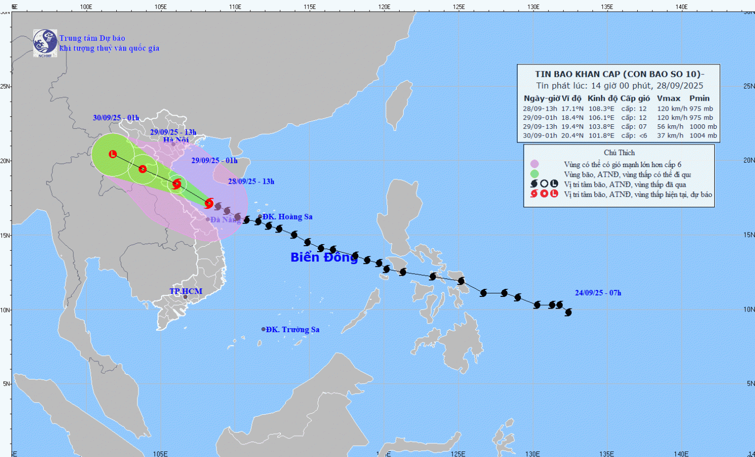 | 01 giờ ngày 29/9 | Tây Tây Bắc, 20-25km/h | 18,4N-106,1E, trên vùng ven biển Nghệ An- Bắc Quảng Trị | Cấp 12, giật cấp 15 | Vĩ tuyến 15,5N- 20,0N; phía Tây kinh tuyến 111,0E | Cấp 3: vùng biển phía Tây khu vực Bắc Biển Đông; vùng biển từ Thanh Hóa đến Tp. Đà Nẵng (bao gồm đảo Hòn Ngư, đặc khu Cồn Cỏ); Bắc vịnh Bắc Bộ (bao gồm đặc khu Bạch Long Vĩ, Vân Đồn, Cô Tô, Cát Hải và đảo Hòn Dấu). Cấp 4: khu vực đất liền ven biển từ Nghệ An đến phía Bắc Quảng Trị |
