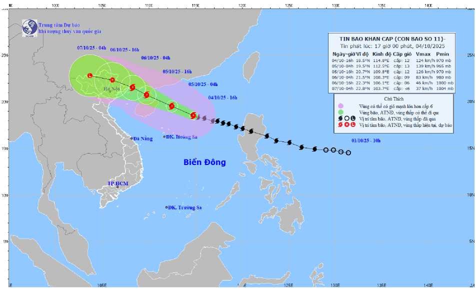 | 16 giờ ngày 05/10 | Tây Tây Bắc, 2025km/h và có khả năng mạnh thêm | 20,7N-109,8E; trên khu vực phía Tây bán đảo Lôi Châu (Trung Quốc); cách Quảng Ninh khoảng 250km về phía Đông Nam | Cấp 12, giật cấp 15 | Phía Bắc vĩ tuyến 16,50N; kinh tuyến 109,00E- 118,00E | Cấp 3: Khu vực Bắc Biển Đông |