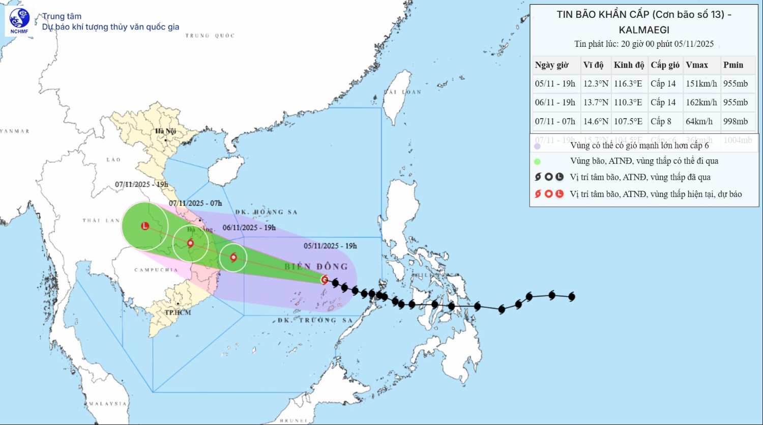 Bản đồ dự báo quỹ đạo và cường độ của bão phát lúc 20h00, ngày 05/11/2025.